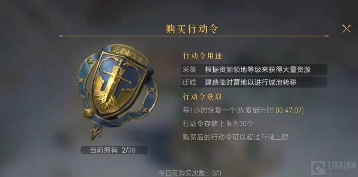 2、行动令每小时恢复一个,也可以使用帝国币进行购买,行动令存储上限为30个,购买后的行动令可以超过存储上限,新手期迁移则无需花费,也不需要时间去建设临时营地。
