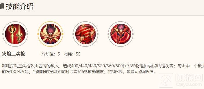 三、一技能是火焰三尖枪,是主要输出技能,还能够提升移动速度,需要主加。