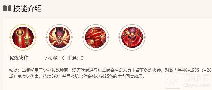 二、哪吒的被动为炙炼火种,能够造成持续的真实伤害并附加减少生命恢复的效果。