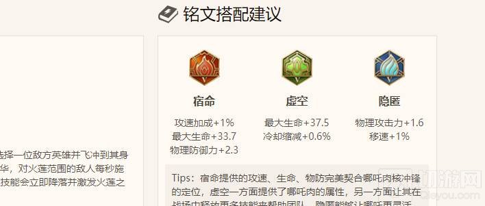 六、铭文选择宿命、虚空和隐匿,能够为哪吒提供生命、物理攻击、物理防御、攻速、冷却缩减和移动速度,非常全能。