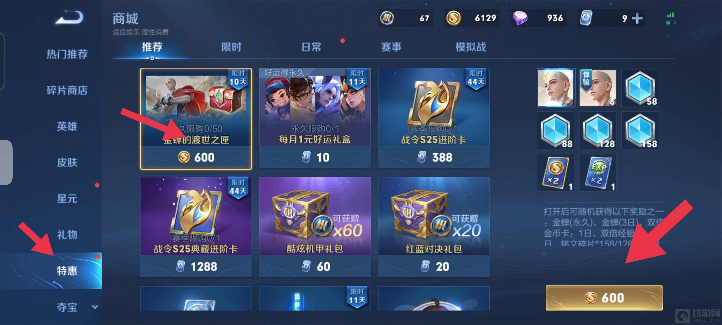 2、在王者商城中,点击特惠,打开特惠后就能看到金蝉的渡世之匣,然后点击就能用600金币来抽刚上线的英雄金蝉。