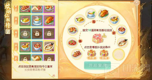 3、烹饪说明,炊烟仁相待是放置挂机类玩法,烹饪菜肴,开启宴席为目的。提交10道菜肴开启则完成任务,菜谱及食材在市集中获取,安排帮手在市集中收集即可。烹饪可增加烟火仁心值。每晚10点结算排行榜发放奖励。