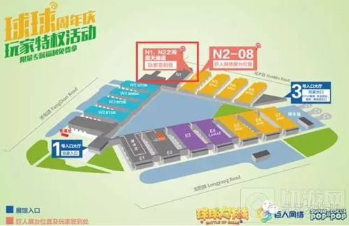 2.验票入场后请前往N1展馆与N2展馆之间的露天通道(点击上方查看大图),现场打开游戏ID二维码(需现场打开游戏,保存二维码图片是无法进行签到的;且签到所用游戏ID必须与报名所用ID一致)进行签到(签到时间:09:30)并领取球球专属T恤和活动说明卡。
