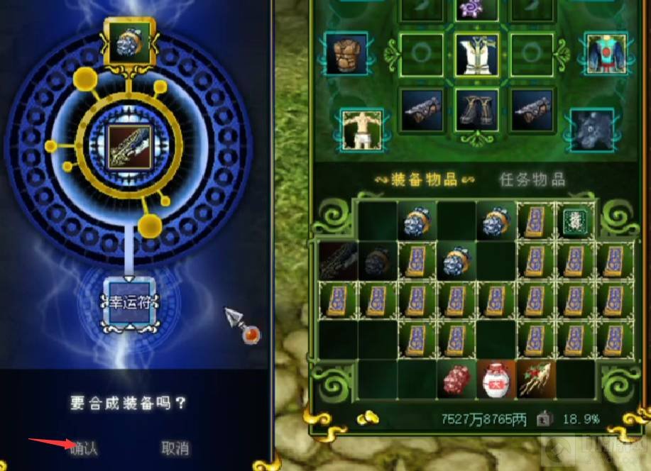 3. 将武器和要合成石头放在里面,添加一张幸运符,点击确认即可。