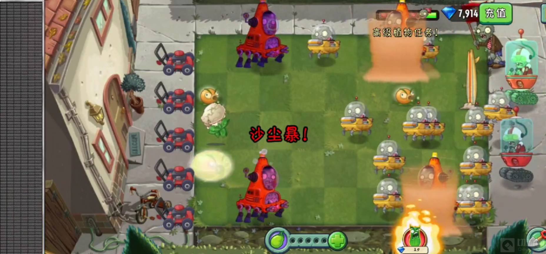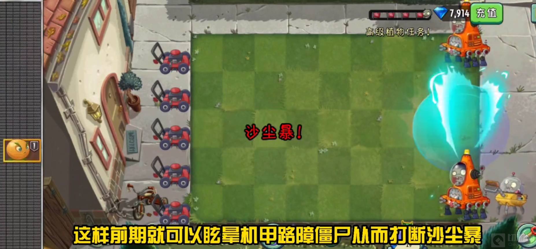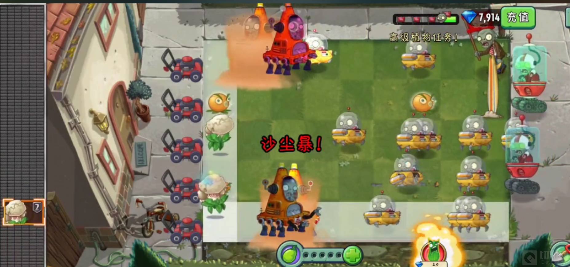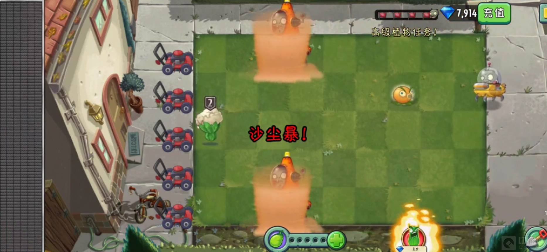 1.这关是传送带随机产生植物,前期的沙尘爆比较难防,所以开局植物也是比较重要的。