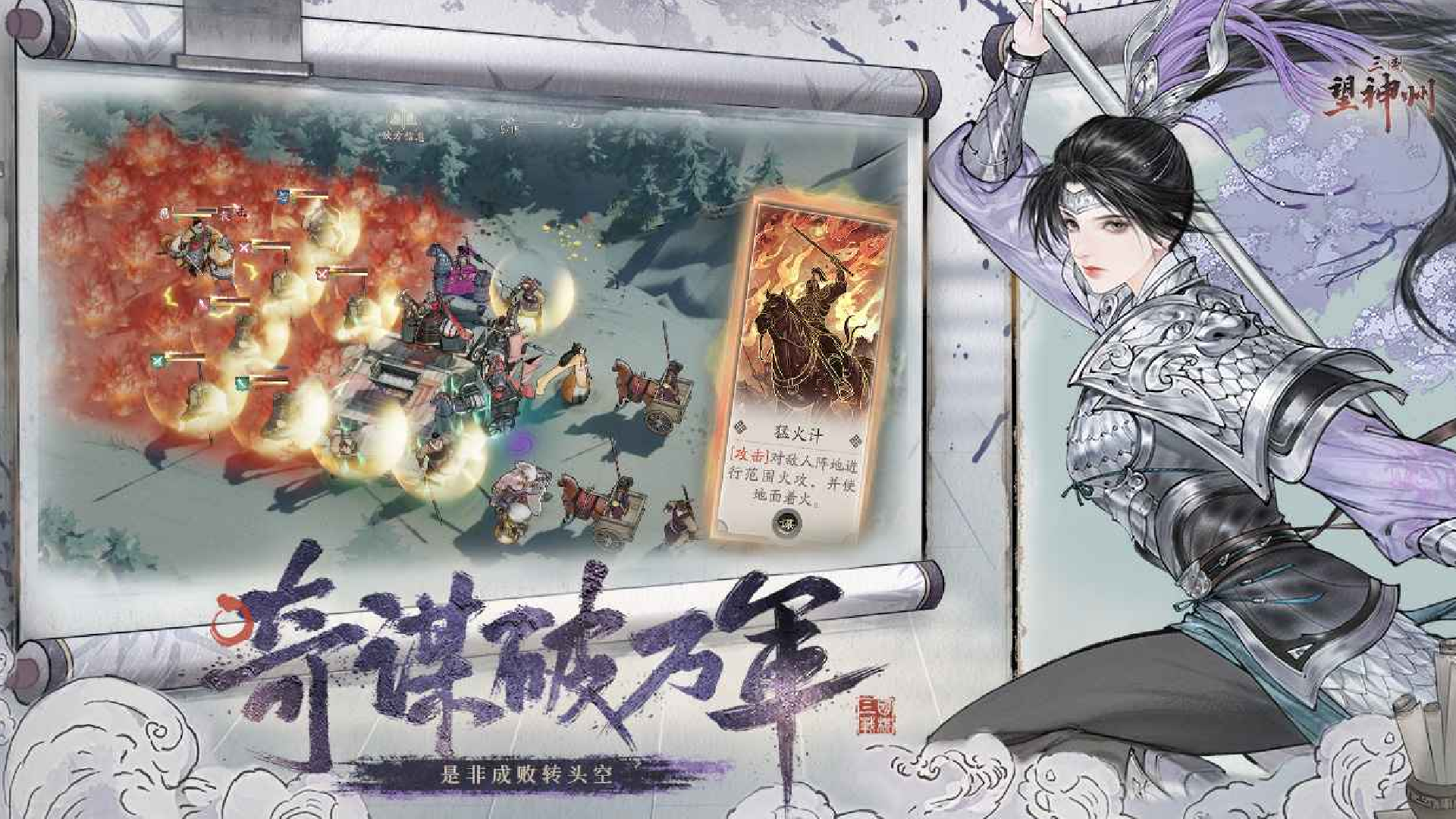 截至2025年4月7日,游戏已官宣「再来战测试」定档同年5月9日,并联动央视版《三国演义》主题曲发布合作PV。此前游戏曾以《代号南乡子》为名进行测试。2025年6月,《三国望神州》将开启测试。战斗系统包含四类属性相克体系,玩家需利用地形、奇谋机制及合击策略取胜。阵容搭配强调星级、阵营加成与技能组合,提供基础与进阶阵容推荐。单机剧本模式允许玩家探索获取副将。