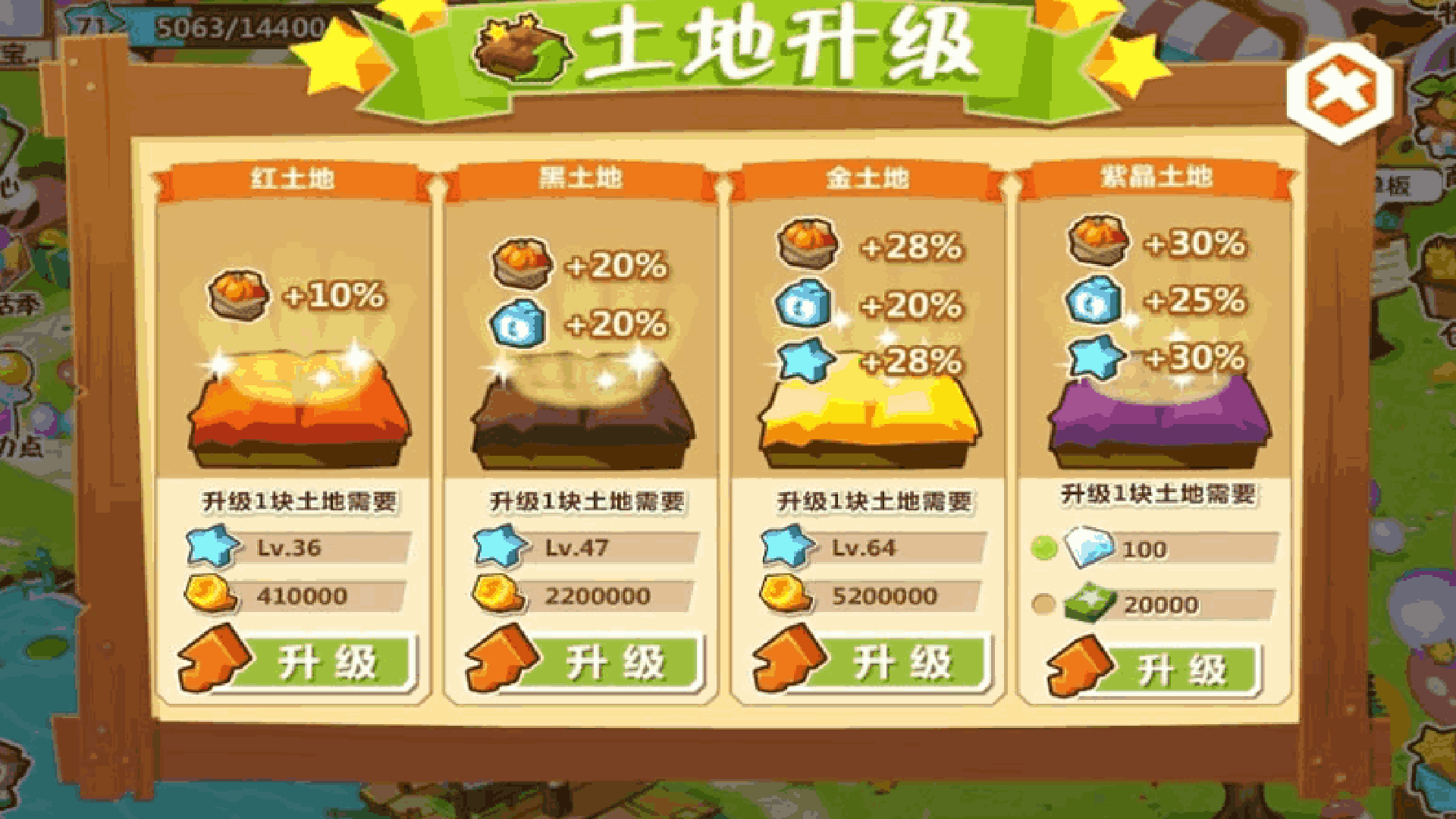扩展机制:通过金币购买新土地(最多可开垦多块),或升级红土地、黑土地提升产量。
