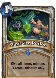 缩小药水:1费,敌人全体随从-3攻击力。基本可以类比为全体友军本回合内获得圣盾,牧师作为一个不铺场的职业,用它来做优势随从交换比较蠢,更多的应该是配合疯狂药水、暗影狂乱和白富美(以前牧师只能缩小白富美伊瑟拉,现在女王也可以拉了( ‵o′)凸)。减了攻但不减屁股,不利于疯狂药水和暗影狂乱换怪,而白富美一般只适用于控制牧师,上文已经论证了两卡combo只为了拉拉女王之类的很蠢,所以这卡不强,或者说不适用于目前的牧师套路,需要看接下来新卡还有没有能配合的。
