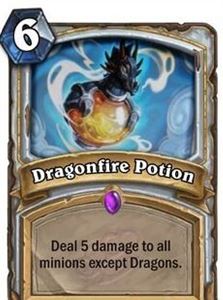 龙火药水:6费,对所有非龙随从造成5点伤害。龙版圣光炸弹,暴雪依然是卯足了劲要推广龙牧,只是之前推的卡牌很蠢,现在推的卡牌很强而已。即使是非龙系的控制牧师卡组也有满编的理由,仅仅多1费但比极恶之咒多了2点AOE伤害,足可清掉绝大多数随从。值得一提的是,中速牧师或许并不需要这张卡,因为这张卡会卡自己铺场,依然是一张“不灵活”的解。