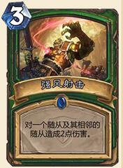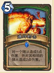 这张卡和德鲁伊的横扫有些相似,但目标不可以选择对方英雄,在很多的时候,爆炸射击会创造出许多惊人的效果。举个例子来说,如果对方站位不慎,在很多图腾中放上一个055或者一个火元素,一张爆炸射击,足够让对面半天回不过来神的。