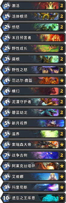 Kolento放弃了加基森,无面等卡,换了双腐根作为减慢对方攻势的解牌,增加了一张新月视界用来过牌,大帝的减费效果可以帮我方抢到节奏,双战争古树打快攻的能力则会更强。