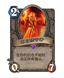 最后,即使在面对非快攻卡组时,这张卡也不是一无是处,在面对宇宙术时三费的末日可以压对手的暮光幼龙和山岭巨人,同时清完场面后的末日往往可以卡到对手的节奏或者耗费对手的资源。