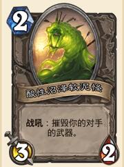 我一直认为酸性软泥怪是基础卡中最强的,吃掉一个31的炙炎战斧并拥有一个32站场是其他所有基础卡都做不到的。同时二回合摧毁一个武器不止意味着回三点血,也会削弱海盗之间的配合,特别是当对手手里有升级/血帆教徒的时候。没错这张卡有局限性,特别是当对手是非武器职业的时候。然而现在环境中充斥着大量的武器职业,即使在面对盗贼的时候,吃一把英雄技能的刀也可以让对手多花两费——让你得到节奏。
