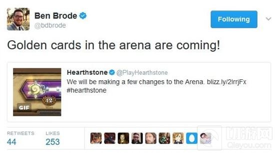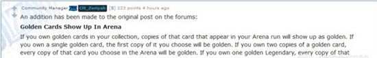 大家好,今天小编为各位朋友带来了炉石传说竞技场金卡的相关内容,社区经理Zeriyah在reddit发帖表示:金卡可以在竞技场显示了,如果你收藏中有相应卡牌的金卡,你在竞技场选到的该牌将会以金卡形式出现。如果你收藏中只有一张,那么只有你选到的第一张该牌会是金的。如果你的收藏中有两张。那么你接下来选到的所有该牌都会是金的(哪怕你选了超过两张)。如果你有一张金色橙卡,那么你接下来选到的所有该橙卡都会是金的。